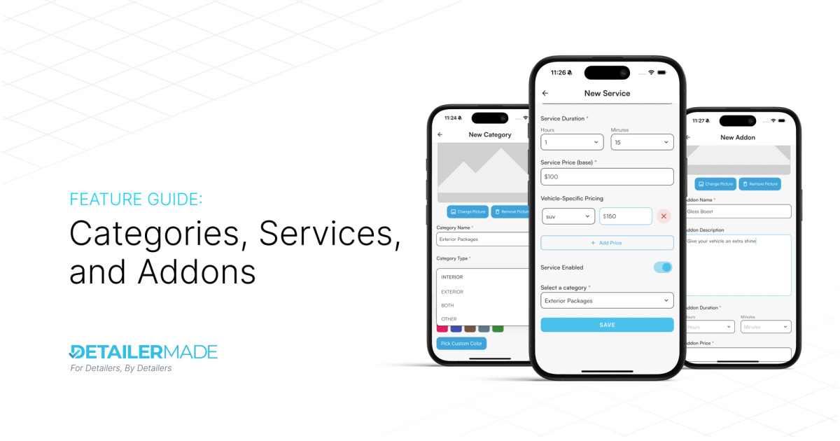 The Services feature gives you complete control over your detailing service menu. Create organized categories, detailed service packages, and smart add-ons that automatically appear based on the service type your customer selects.